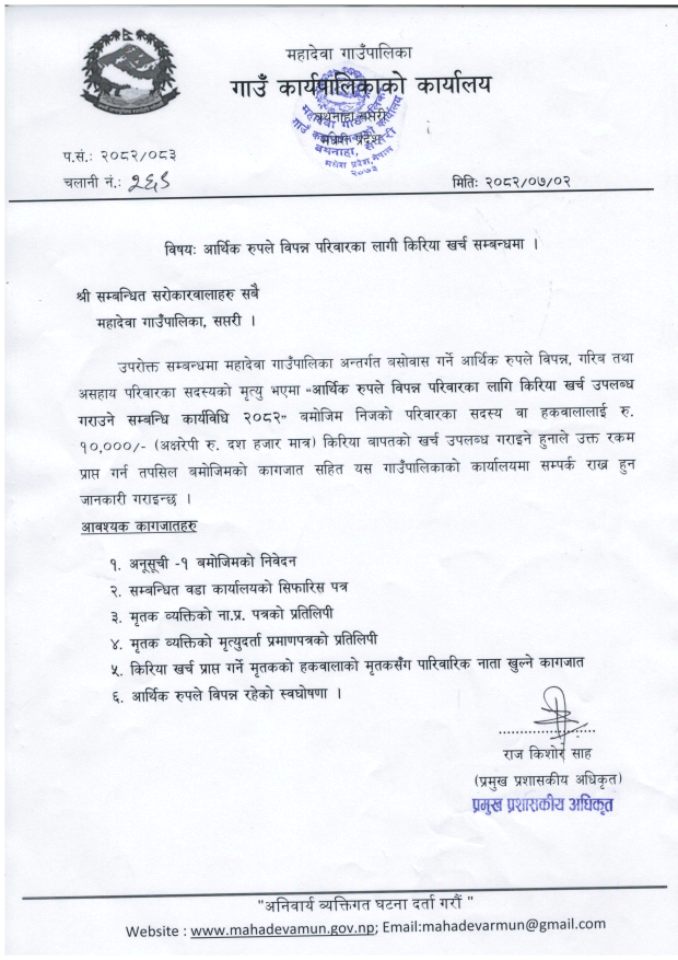 आर्थिक रुपले विपन्न परिवारका लागी किरिया खर्च सम्बन्धमा