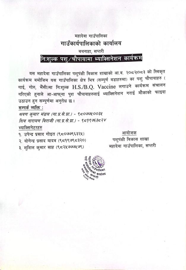 नि:शुल्क पशु/चौपायामा भ्याक्सिनेशन कार्यक्रम ।