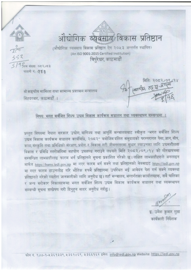 भगत सर्वजित शिल्प उद्यम विकास कार्यक्रमका लागि आवेदन पेश गर्ने सम्बन्धी सूचना