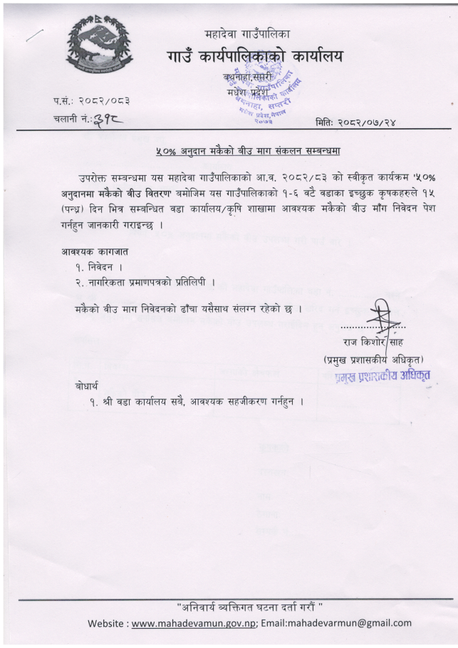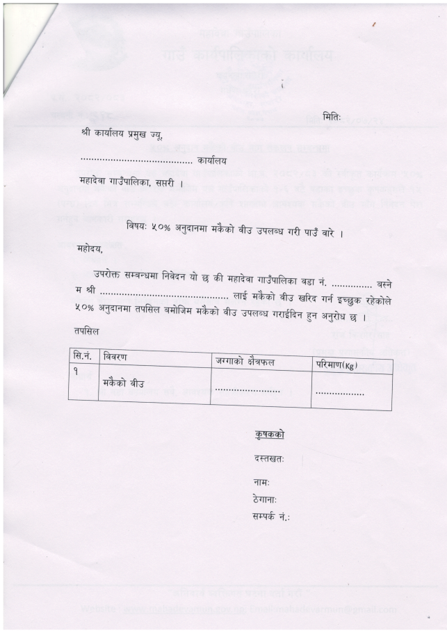 ५०% अनुदान मकैको वीउ माग संकलन सम्बन्धमा