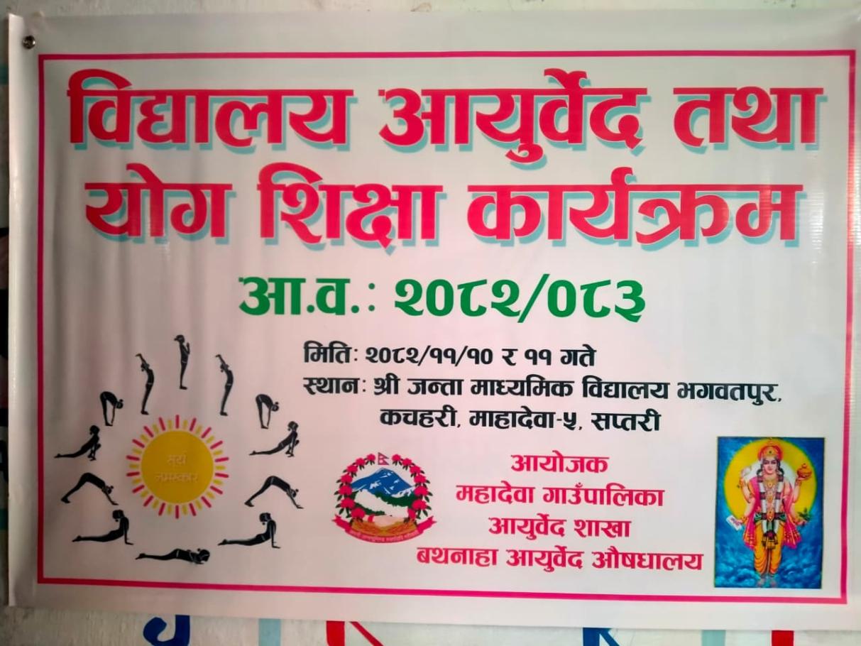 आ.ब.२०८२/०८३ बिधालय आयुर्वेद तथा योग शिक्षा कार्यक्रम श्री जनता माध्यमिक विद्यालय भगवतपुर,कचहरी सप्तरीमा मिति २०८२/११/१० र ११गते दुई दिने कार्यक्रम कक्षा ७,८,९ र १० का छात्र, छात्राहरुलाई आयुर्वेद तथा योग सम्बन्धि कक्षा सञ्चालन गरि कार्यक्रम सम्पन्न गरिय