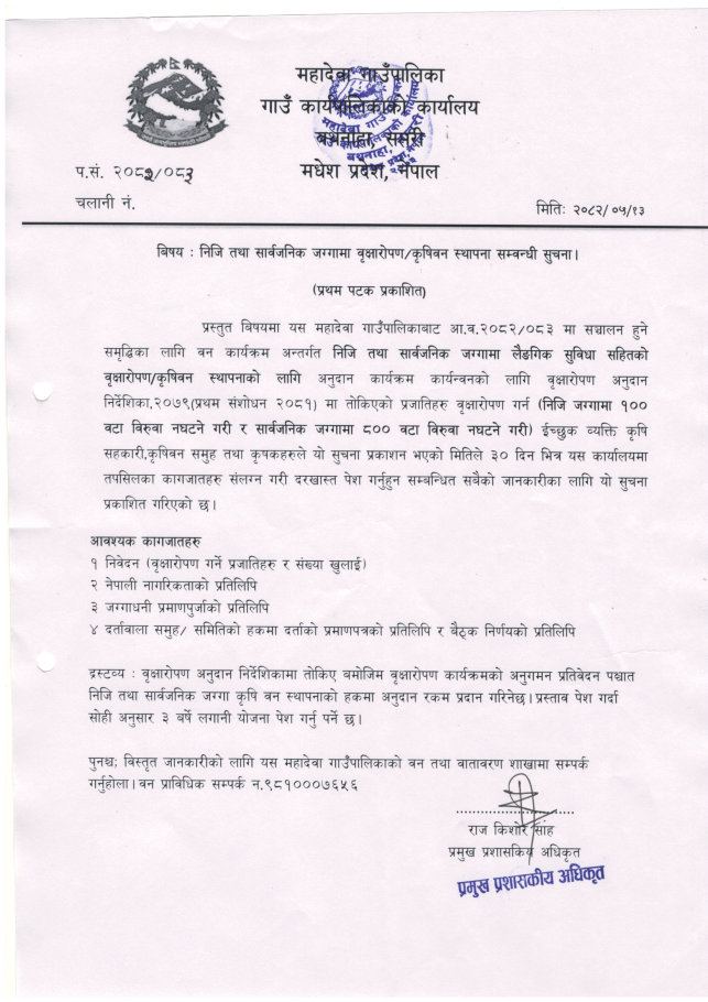 निजि तथा सार्वजनिक जग्गामा बृक्षारोपण/कृषिवन स्थापना सम्बन्धी सूचना ।