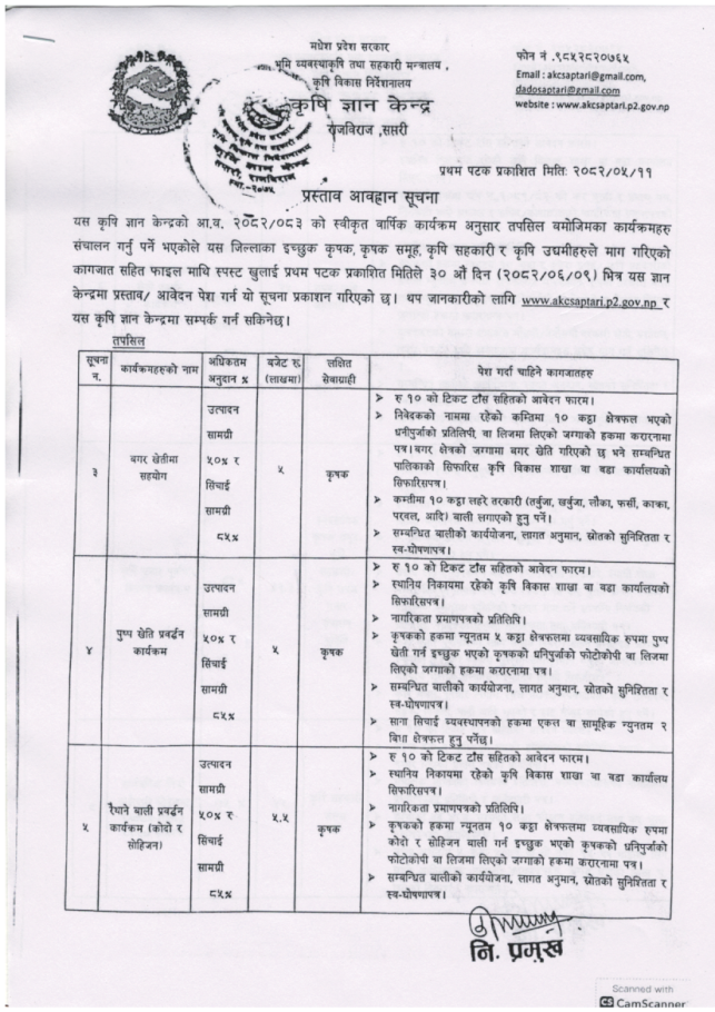 श्री कृषि ज्ञान केन्द्र, राजविराज, सप्तरीद्वारा प्रस्ताव आवह्रान सूचना ।