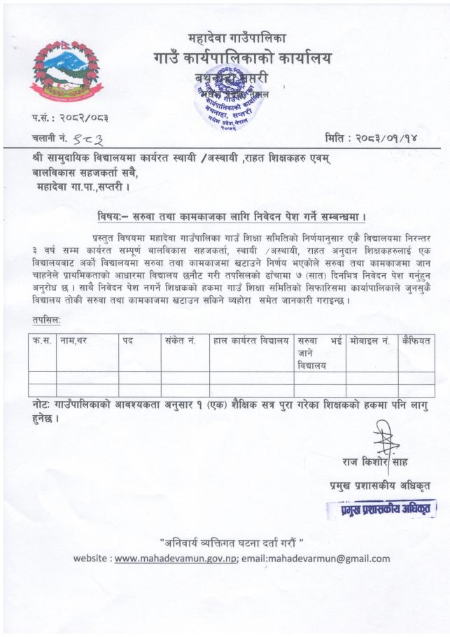 सरुवा तथा कामकाजका लागि निवेदन पेश गर्ने सम्बन्धमा ।