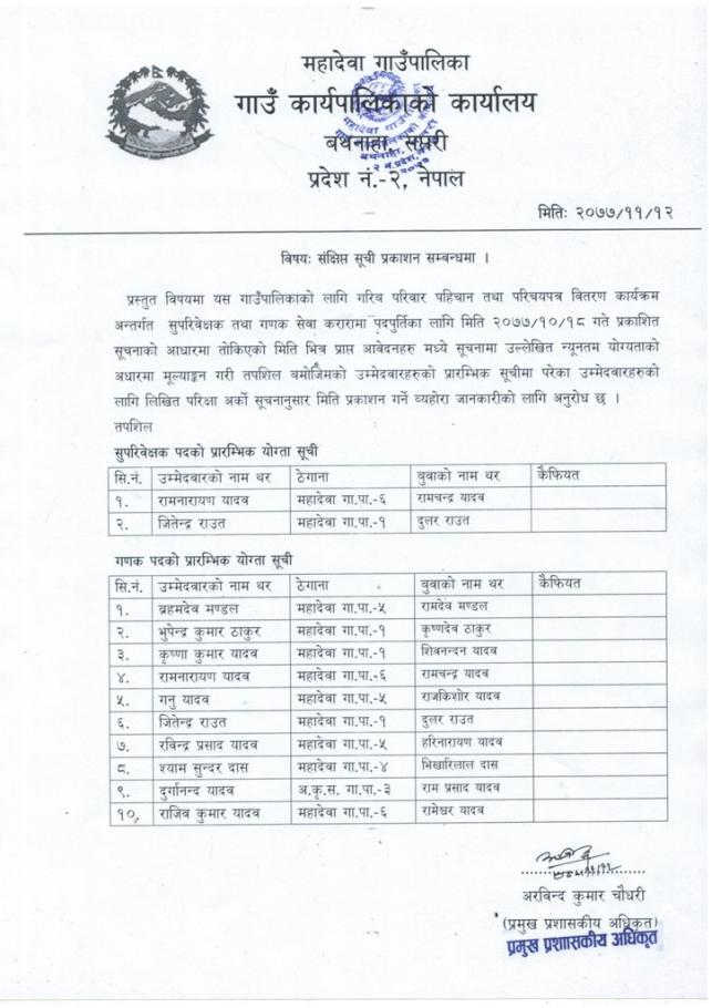 सुपरिवेक्षक तथा गणक पदको संक्षिप्त सूची प्रकाशन सम्बन्धी सूचना ।